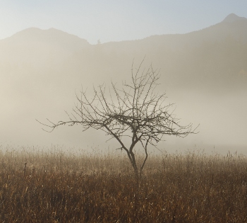 like a photo capturing a lone fruit tree in a field once cleared by hand of every stone